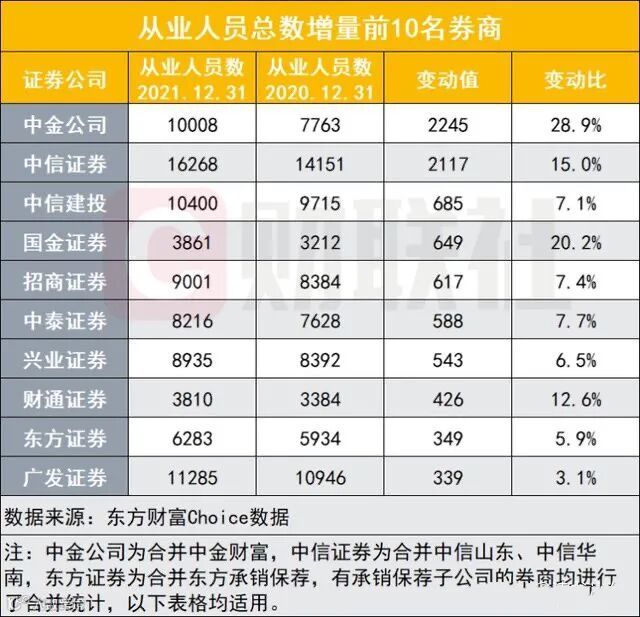 中金公司、中信证券等头部券商扩充人员均超过2000人,比如,中金公司增加2245人,公司从业人数突破1万人大关,增幅高达28.9%。