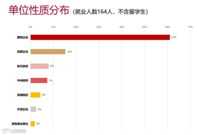 在选择就业的164个非留学生中,毕业生去向主要为一行三会(中国人民银行、证监会、保监会、银监会),各大银行总行,各大金融机构,券商,投资公司,外资银行等。排在前三名的行业为证券、投资和金融监管/政府机构/事业单位。超过半数的同学选择了国有企业开始毕业后的工作。