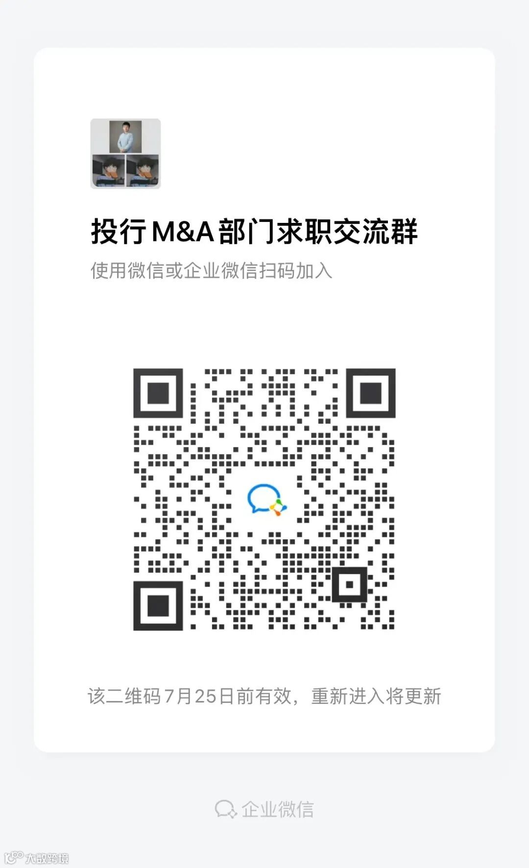 想要了解更多关于投行并购业务资讯以及求职技巧,不如扫描海报下方二维码进群交流,更有业内大佬免费分享!