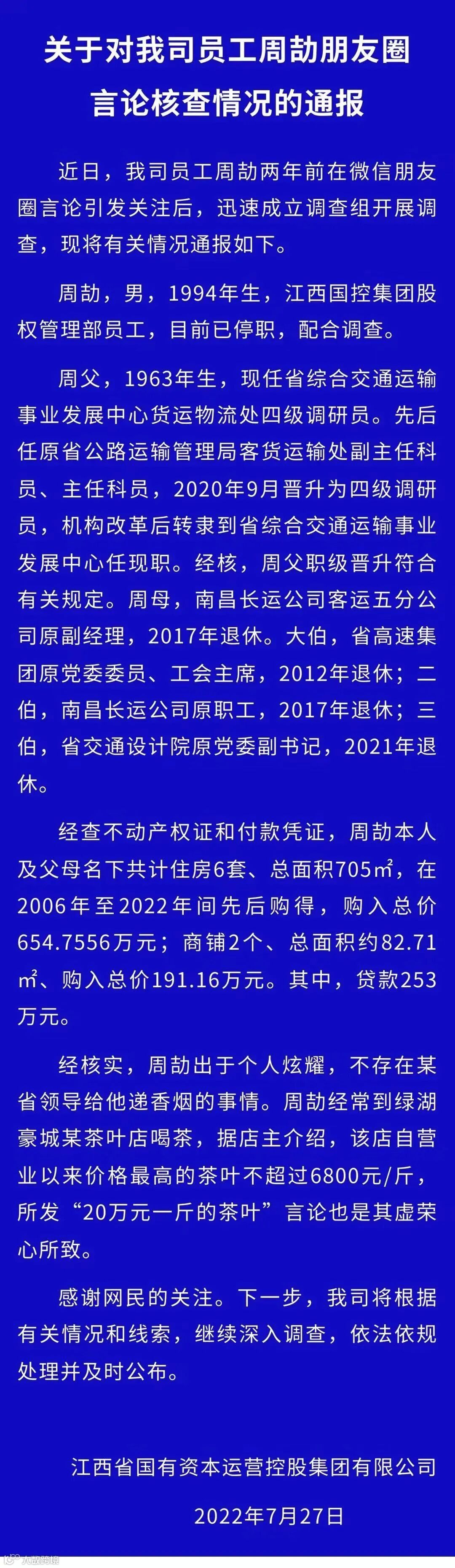 从通报上来看,周劼所发朋友圈的内容都不是真实的,他是管理部普通员工,1994年出生,目前已经停职配合调查。周劼的父亲晋升符合规定,大伯和三伯分别是省高速工会主席,省交院副书记,已退休。