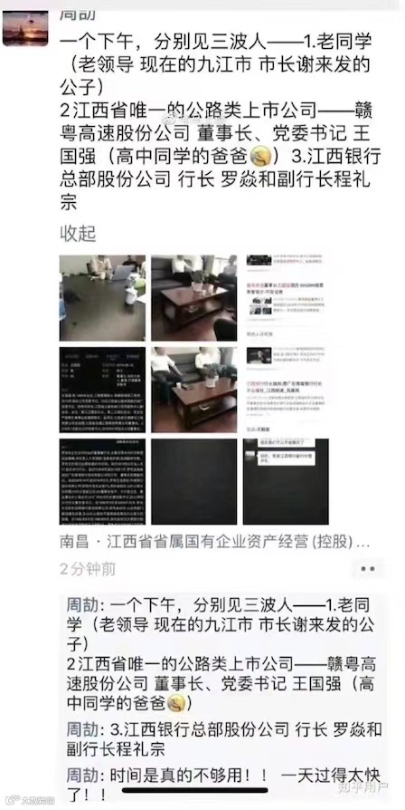 一个下午就见了三拨人,九江市的市长的公子哥;高速股份公司的董事长;江西银行的行长。