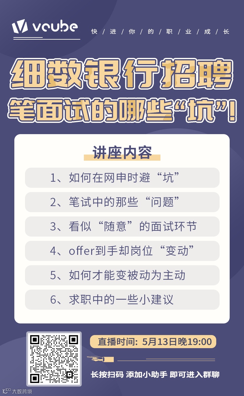而其中最难的笔试和面试环节,往往也是委托第三方出具试题,统一笔试、面试,筛选率都很高,所以一个不谨慎,在笔试和面试的每个环节都可能折戬沉沙,错过进入银行的机会。