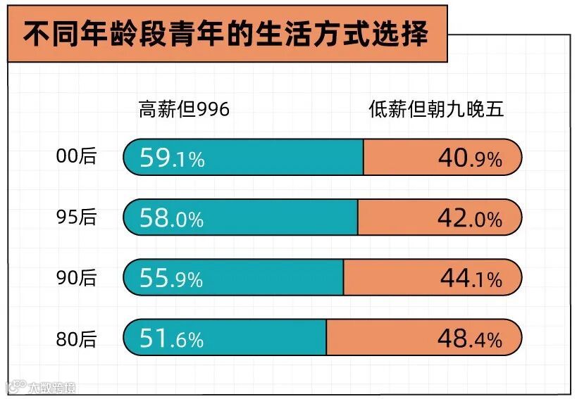 生活方式上,年轻的00后、95后尚且保持着为高薪996拼搏的心态,而随着年龄上涨,低薪朝九晚五的轻松生活成了人生新阶段的愿望。
