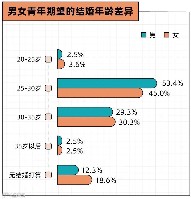 婚龄方面,5成人心目中,25-30岁是最佳结婚年龄,3成人选择30-35岁,仅有不到3%人选择在20-25岁成家。