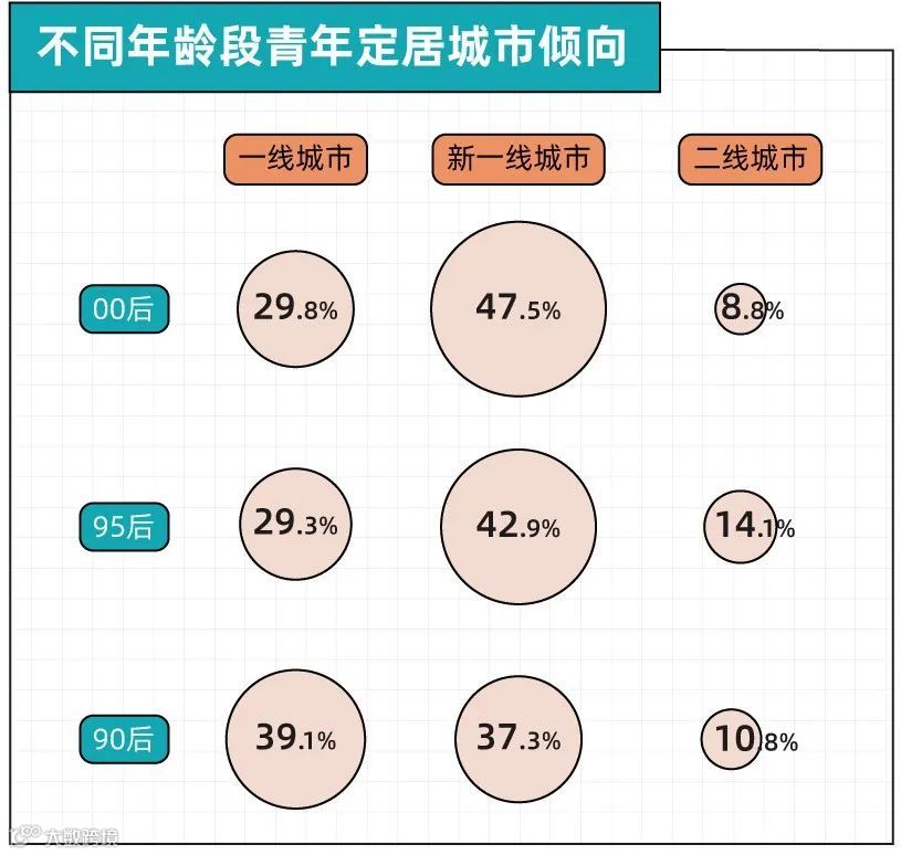 定居城市方面,近半数人眼中,新一线城市是最好的定居选择。从90后到00后,一线城市的吸引力正在逐渐下降,越是年轻人,对新一线城市的好感越强烈,“Work Life Balance”(工作生活平衡)成了更多人的追求。
