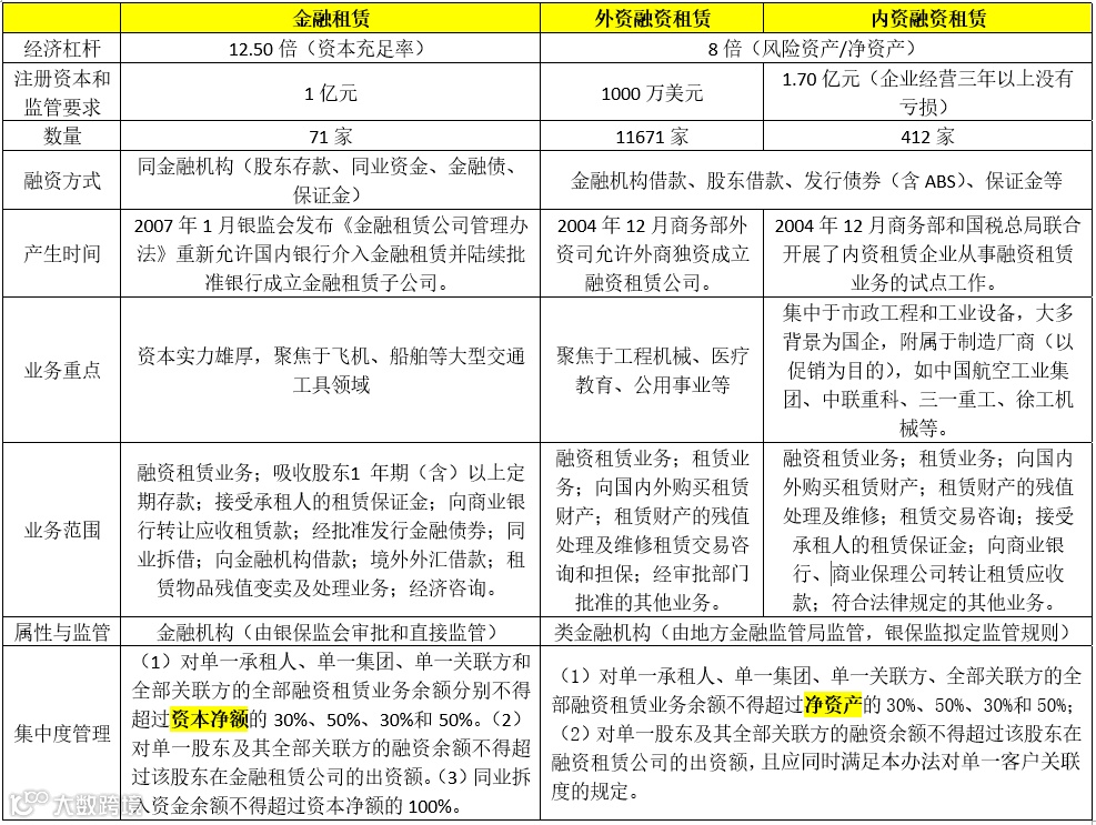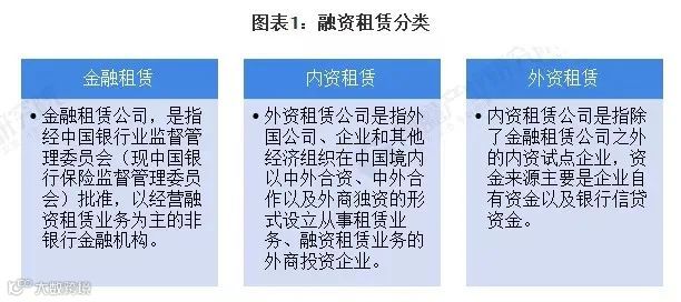 根据机构和监管属性以及资本来源的不同,我国融资租赁机构主要包括金融租赁公司、内资融资租赁公司和外资融资租赁公司三类。