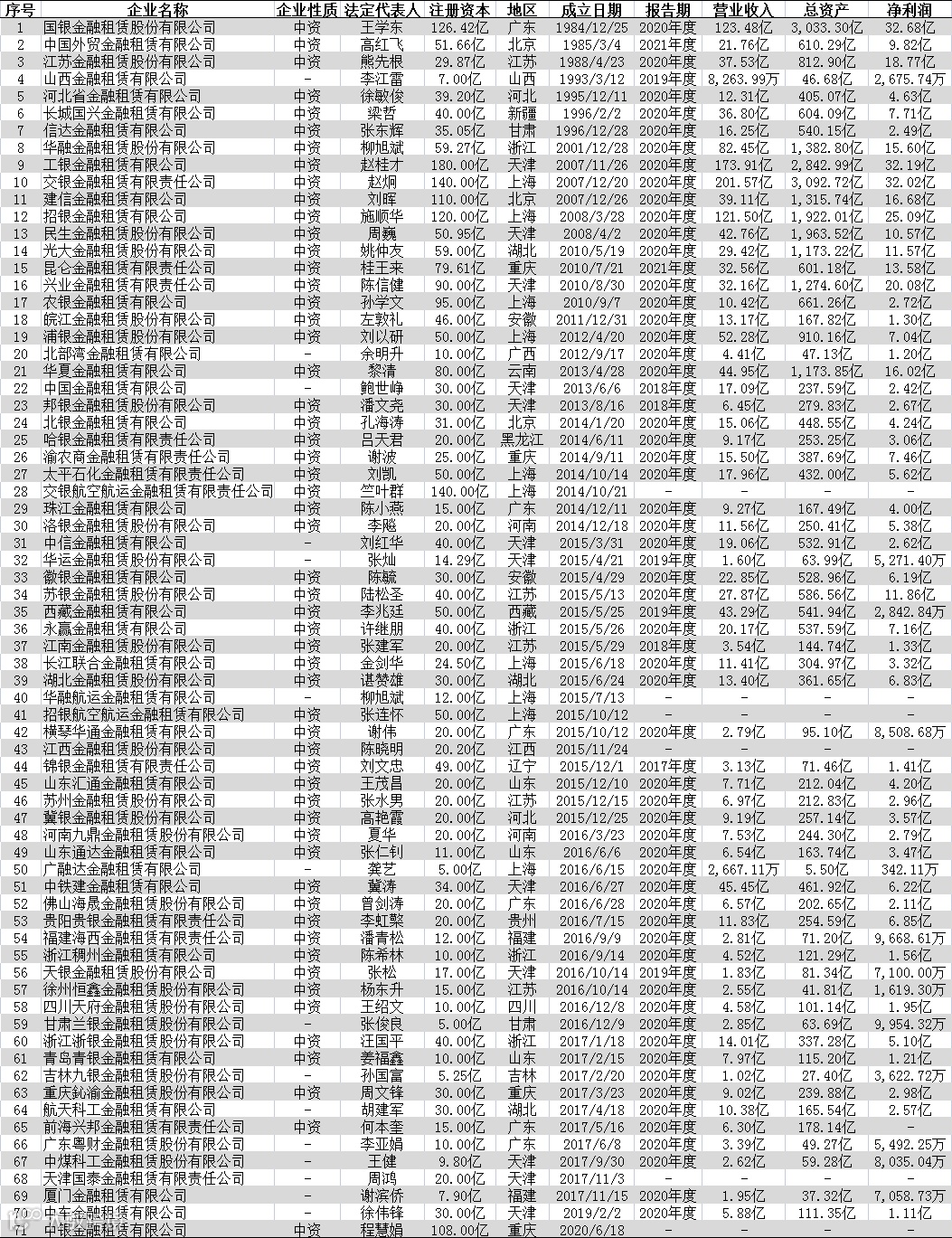 从注册资本来看,最高注册资本是工银金融租赁有限公司,180亿;最低注册资本是甘肃兰银金融租赁股份有限公司,5亿。71家金融租赁公司共计注册资本2854.97亿。