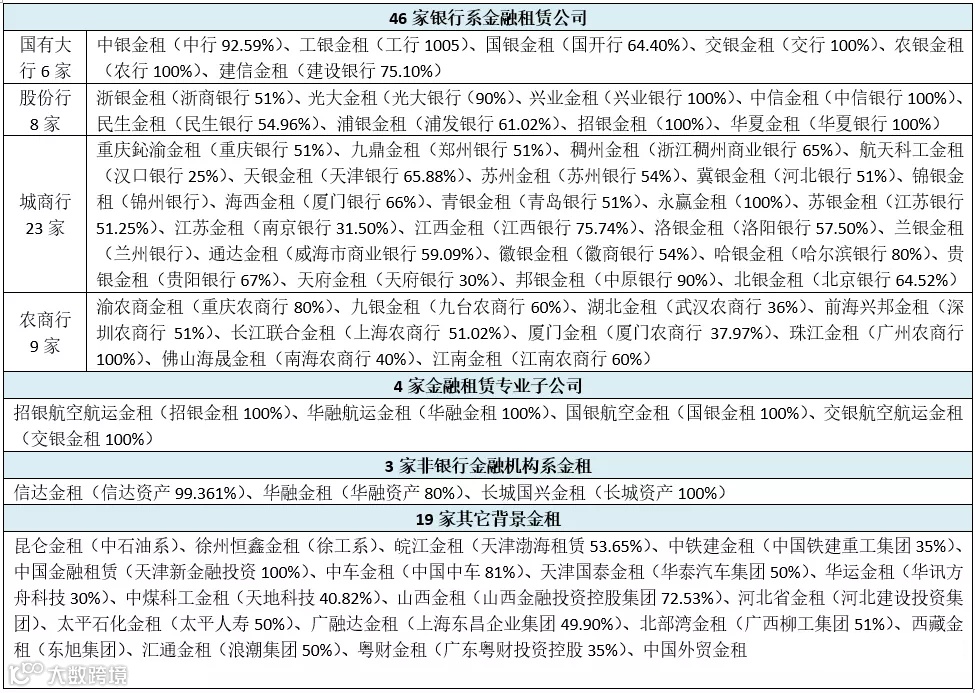 其中,交银租赁、工银租赁、建信租赁、农银租赁、招银租赁和兴业租赁是国有行或股份行全资子公司,永赢租赁是城商行宁波银行全资子公司。