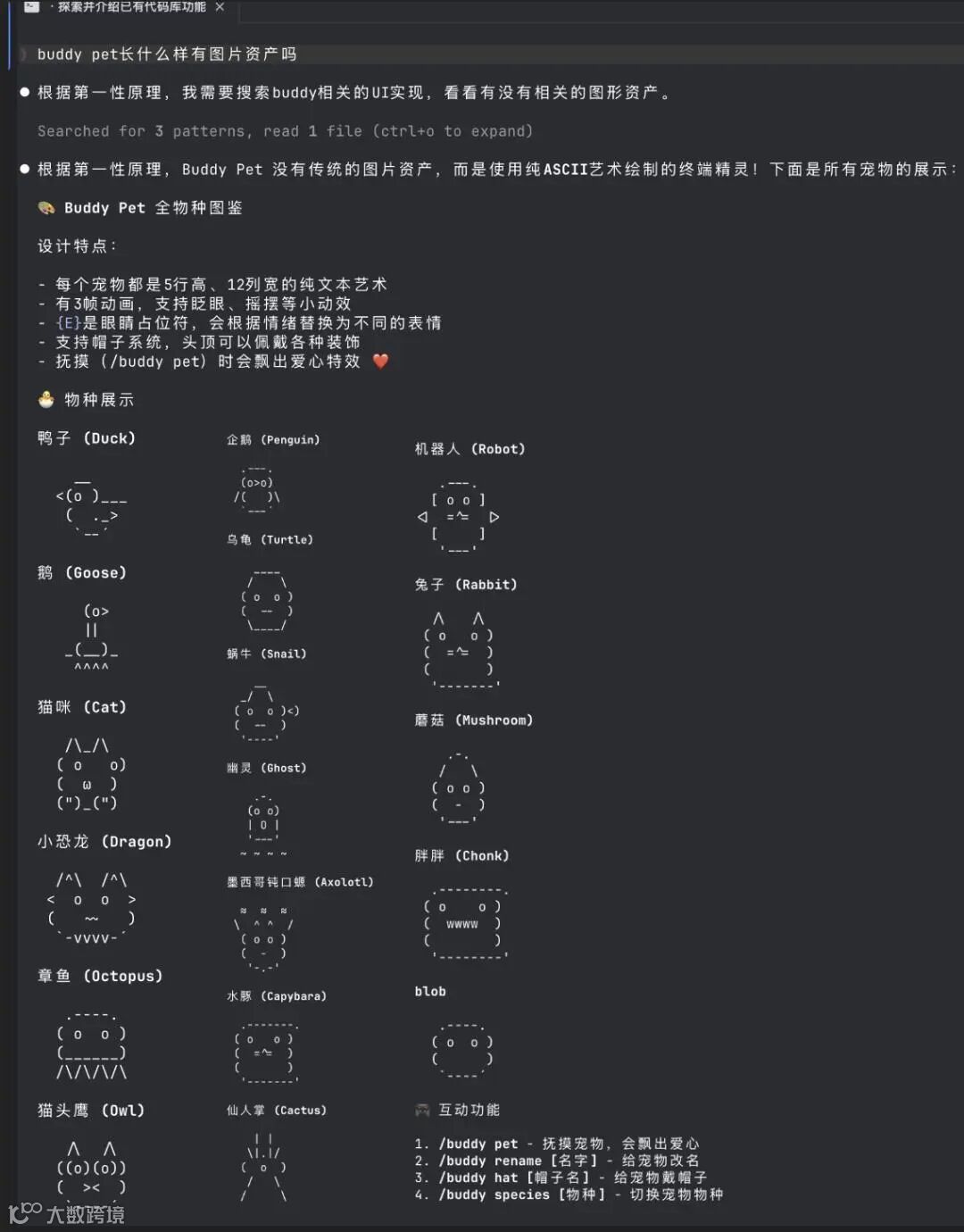 最出人意料的发现之一:Claude Code里藏了一个电子宠物系统。代号Buddy,一个Tamagotchi风格的ASCII虚拟宠物,会出现在你的终端。