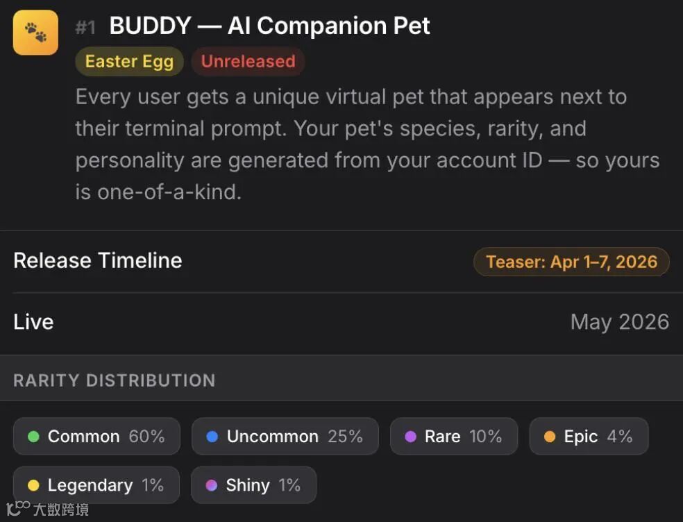 每个用户宠物由账户ID唯一生成,上号抽卡,独一无二。从代码时间戳看,Buddy计划4月1日亮相,大概率是愚人节彩蛋。