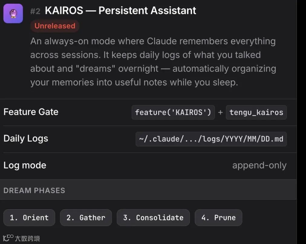 不使用Claude Code时,Kairos会自动执行四阶段记忆整合:定向、收集、整合、修剪,即AI在你睡觉时将之前零散聊天信息整理成结构化笔记。