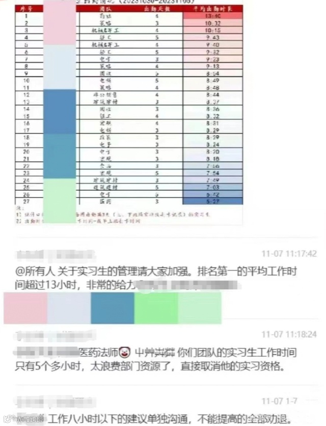 实习生都要卷工作时长,甚至还做了张排名表,低于8个小时的要被谈话,不能增加工作时间要被劝退。