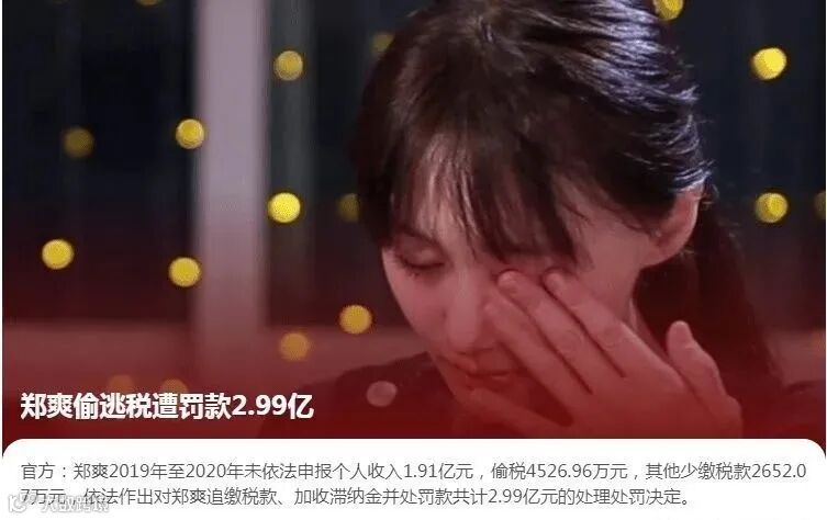 2021年,郑爽被相关部门查出其从2019年到2020年隐藏了个人收入的1.91亿元,逃税4526.96万元,其他税收2652.07万元,并依法对郑爽处以追缴应缴纳的税款,以及滞纳金并处罚款2.99亿元处理处罚决定。结合此前他人披露,从此,她的名字成了新的计量单位。