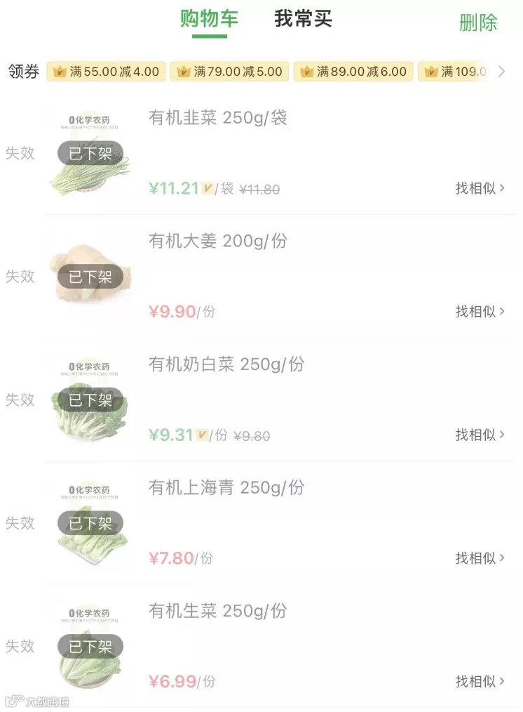 1)提前一天盘点家中需求货品,进入APP,提前加入购物车,此时可能有部分生鲜无货