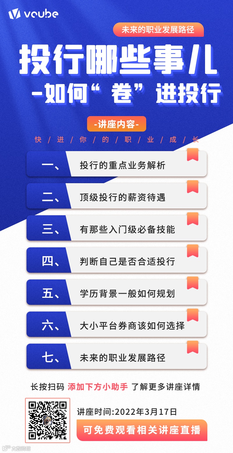 除了努力以外,选对努力的方向也很重要。本次讲座我们将从一个完全的金融小白开始,教你如何卷进投行。想要参与的小伙伴扫描下方二维码加群即可免费参与。