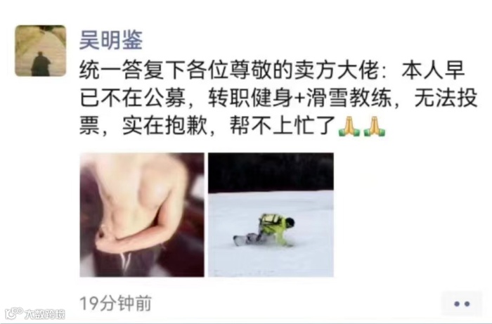 无独有偶,近日前公募基金经理吴明鉴发朋友圈说,已经转行,做健身+滑雪运动,所以卖方来拉票,自己帮不上忙。