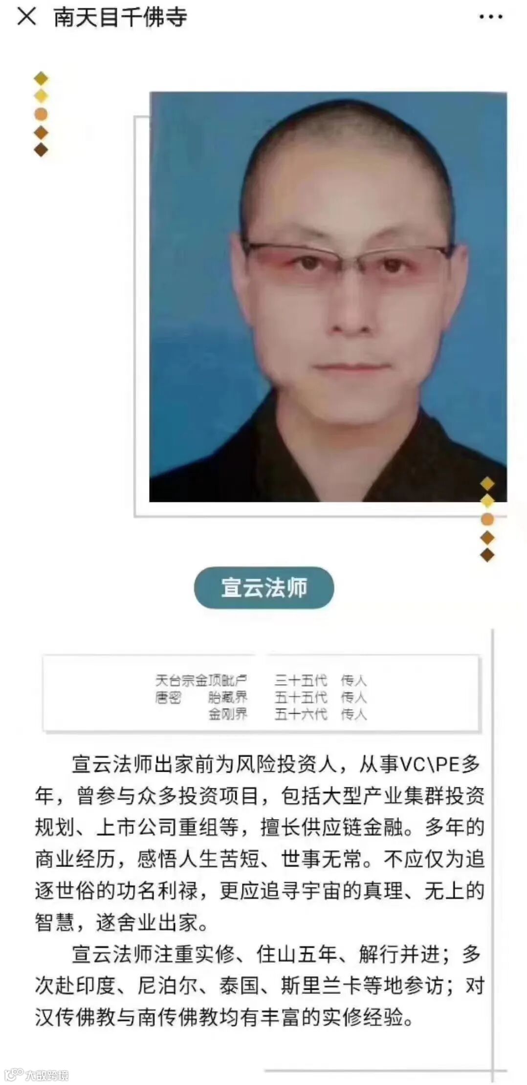 南天目山千佛寺的宣云法师,原来竟是一位风险投资人,参投过众多项目。