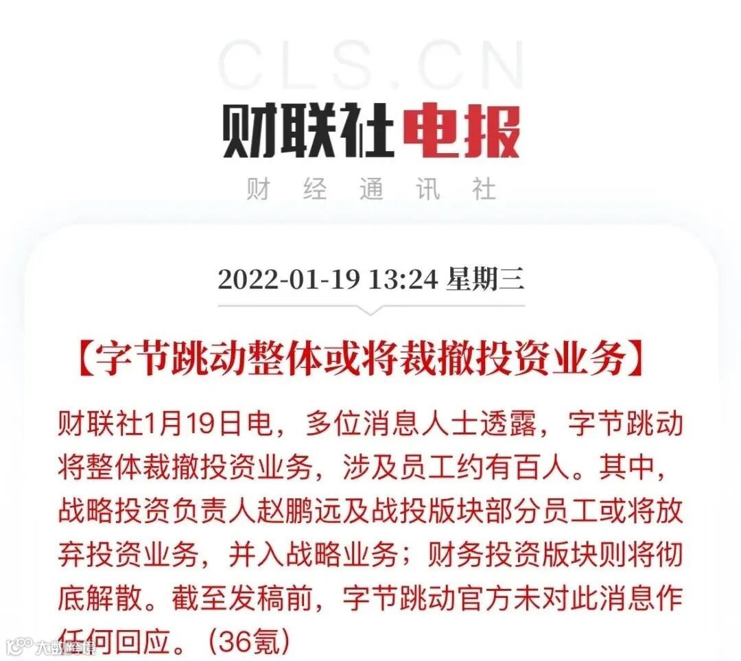 关于字节跳动对投资业务一夜之间一锅端的情况,字节跳动相关负责人回应称,公司年初对业务进行盘点和分析,决定加强业务聚焦,减小协同性低的投资。