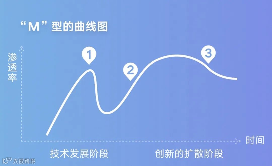 他将“技术成熟度曲线”和“创新扩散曲线”这两个分析框架连在一起,组成了一条M型曲线。