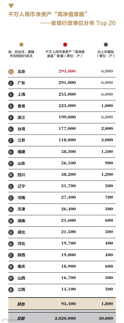 北京超过广东、上海、浙江、香港、台湾、江苏,是我国高净值家庭最多的省份。