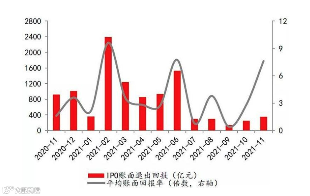 2021年11月,PE/VC退出回报达350亿元,行业退出回报率达到了7.61倍,相比上月呈现大幅上升。