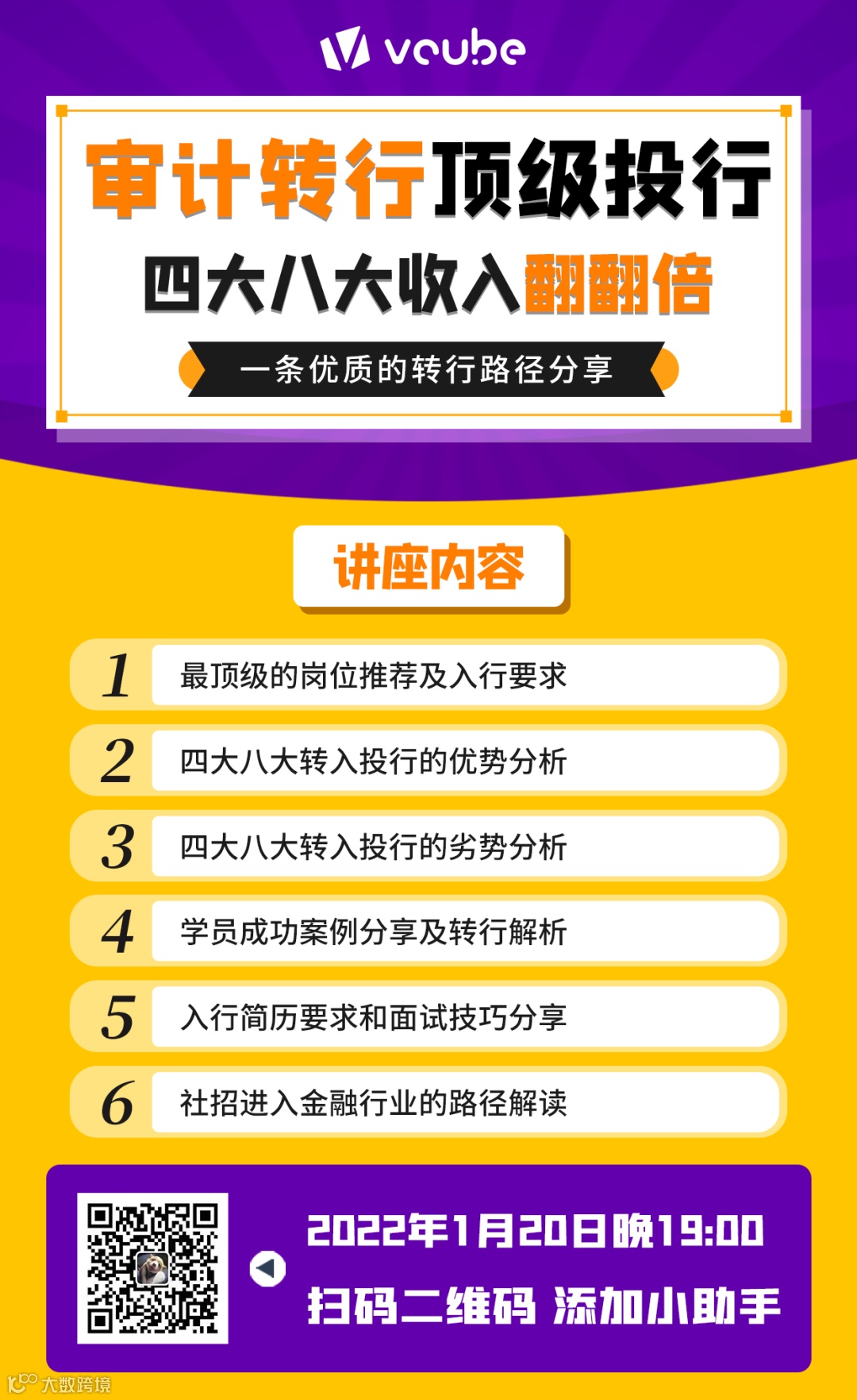 正在四大八大做审计的你是否有这样的疑惑,不用担心,金融小伙伴在年前推出特别活动,手把手叫你审计岗如何转投行。1月20日直播分享,添加小助手进【社招转行交流群】 。