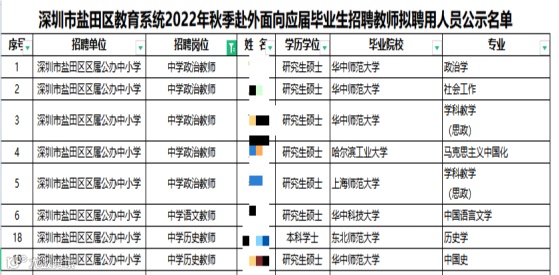 尽管各地学校的校招公告中,对应聘人的学历要求大多为“本科及以上”,但从实际录用情况来看,想要去比较好的中小学校,硕士文凭才是相对保险的“入场券”。如深圳市盐田区公布的2022秋季应届生拟聘用教师名单显示,中学语文、历史、政治公示的8个录用人选中有7个就是研究生硕士,硕士比为87.5%,而中学物理、数学、化学教师硕士比则为75%。