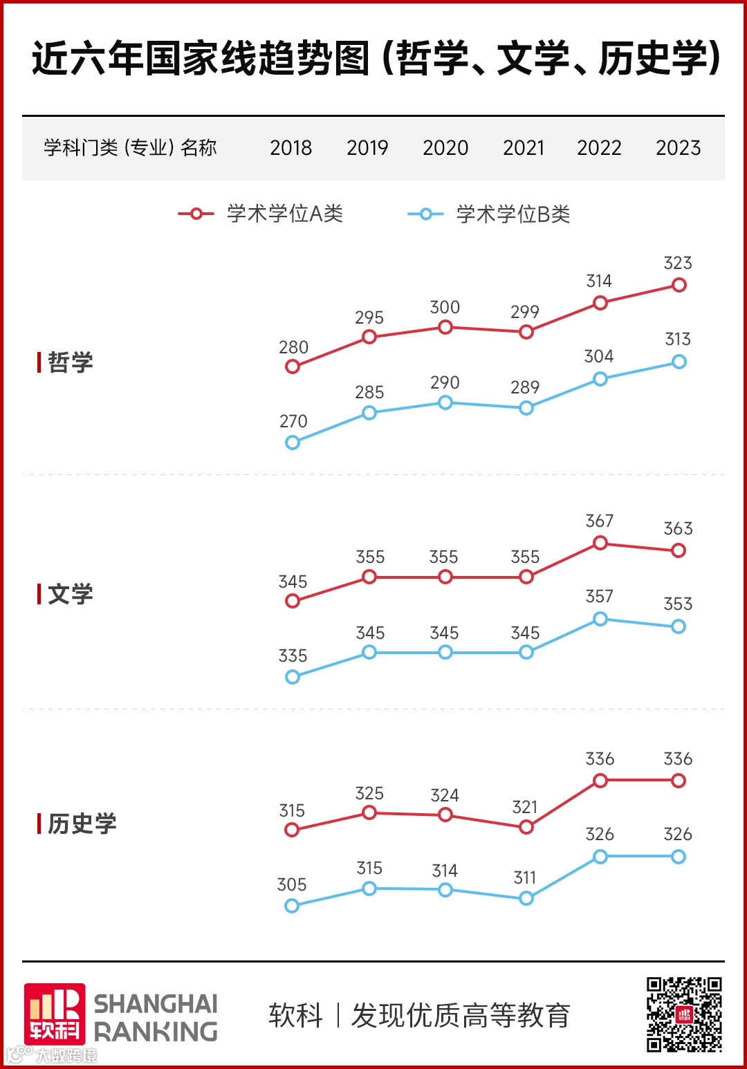 招生人数少、报录比惨烈、备考难度高……种种原因,都使得人文学科专业的考研人越考越难。这些都直接反映在了节节攀升的国家线上:六年前分数线排名同年各学科专业第一的文学类专业,六年后还是冠军;哲学类专业,六年暴涨43分;分本就不低的历史学类专业,上涨同样稳健。