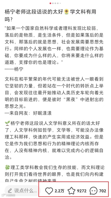 在社交软件“小红书”上,“杨宁”二字是流量密码。他是一名现任教于中央民族大学文学院的大学老师,其关于人文学科重要性的议论,被网友反复引用、点赞,引起了很多文科生的共鸣: