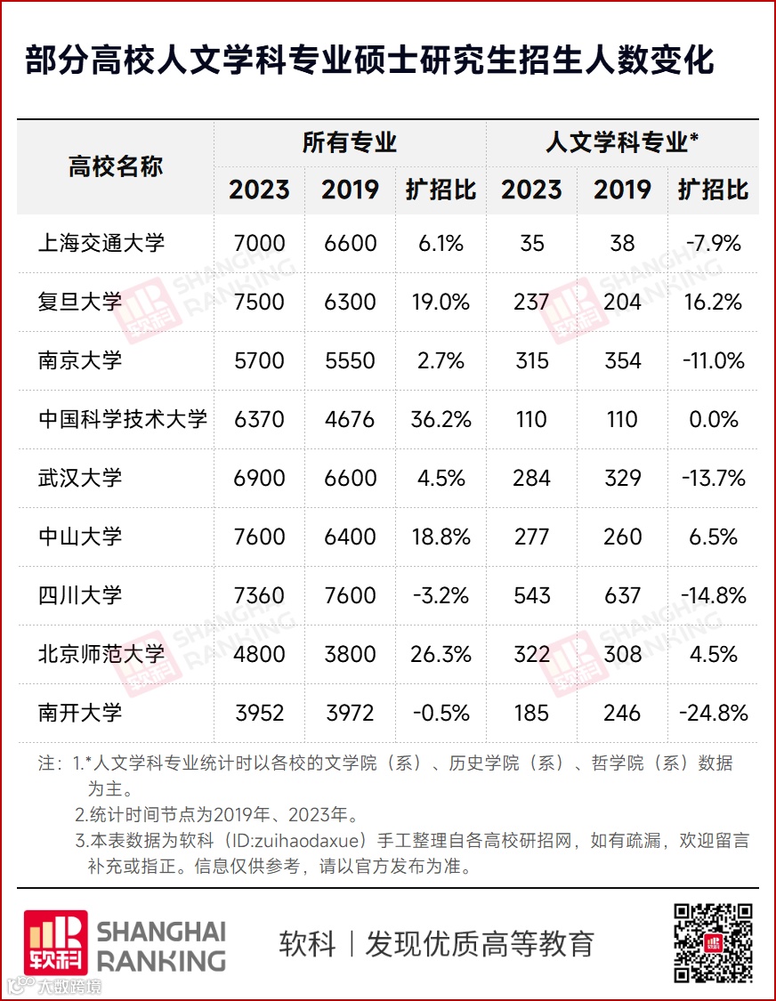 不过研究生总体扩招,和纯文科生没什么关系,毕竟,对于文史哲学科专业而言,大扩是做梦,小扩是奇迹,不扩是正常,缩招则是家常便饭。软科搜集了部分“双一流”高校相关数据,对比了近五年高校整体拟招人数及人文学科专业拟招人数的增长情况: