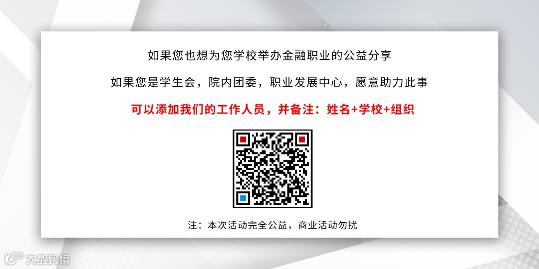 我们致力于以高校巡讲的方式,与来自各大金融机构的在职导师和优秀的师兄师姐一起,共同打破金融求职的信息壁垒,帮助你做好职业规划,找到理想中的工作。