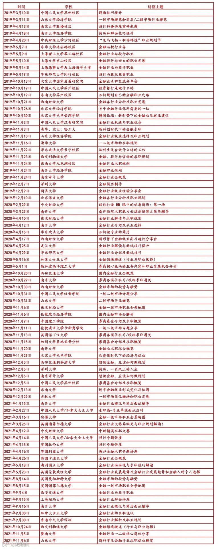 七年公益,百校巡讲,七年来坚持支持各地学校职业发展,每年都会集中数次走进全国各大高校 ,与各校就业中心深度合作,根据学校特色及需求,定制相应的职业分享内容,包括行业大咖讲座、师兄师姐返校分享、校招情况解析、求职技能提升、求职比赛协办等,金融小伙伴是你求职路上的永远陪伴。