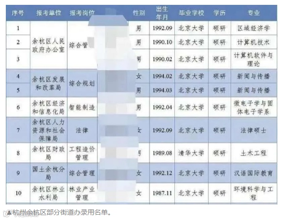 还有之前火遍全网的余杭区街道办招聘公示。在拟录用公示名单里,清一色是来自清华、北大的毕业生,学历硕士起步,博士不乏其人。