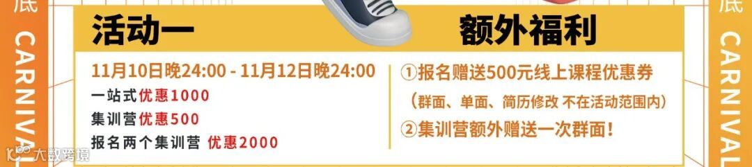 一站式优惠1000元, 集训营优惠500元;报名两个集训营,优惠2000元;