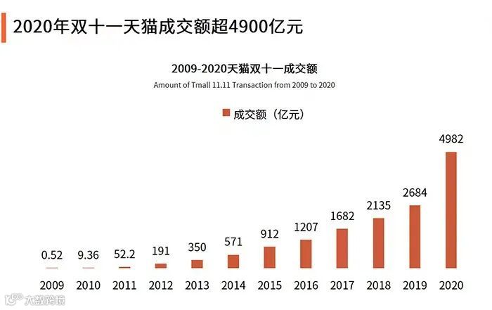 2020年天猫双11全球狂欢季实时成交额突破4982亿。