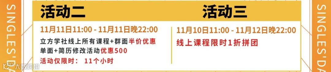 立方学社线上所有课程+群面 半价优惠;单面、简历修改活动,八折优惠。