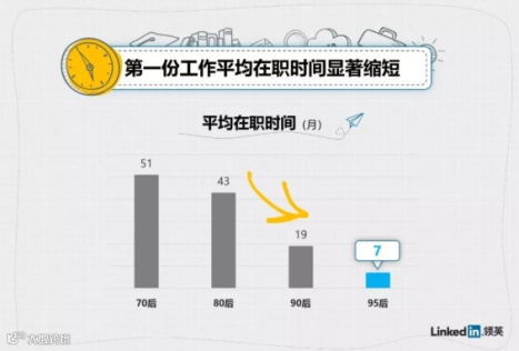 领英之前发布了一份“第一份工作趋势洞察”的文章,从数据中我们可以知道70后的第一份工作平均超过4年才换,80后则是3年半,而90后骤减到19个月,95后更是仅仅在职7个月就选择了辞职。