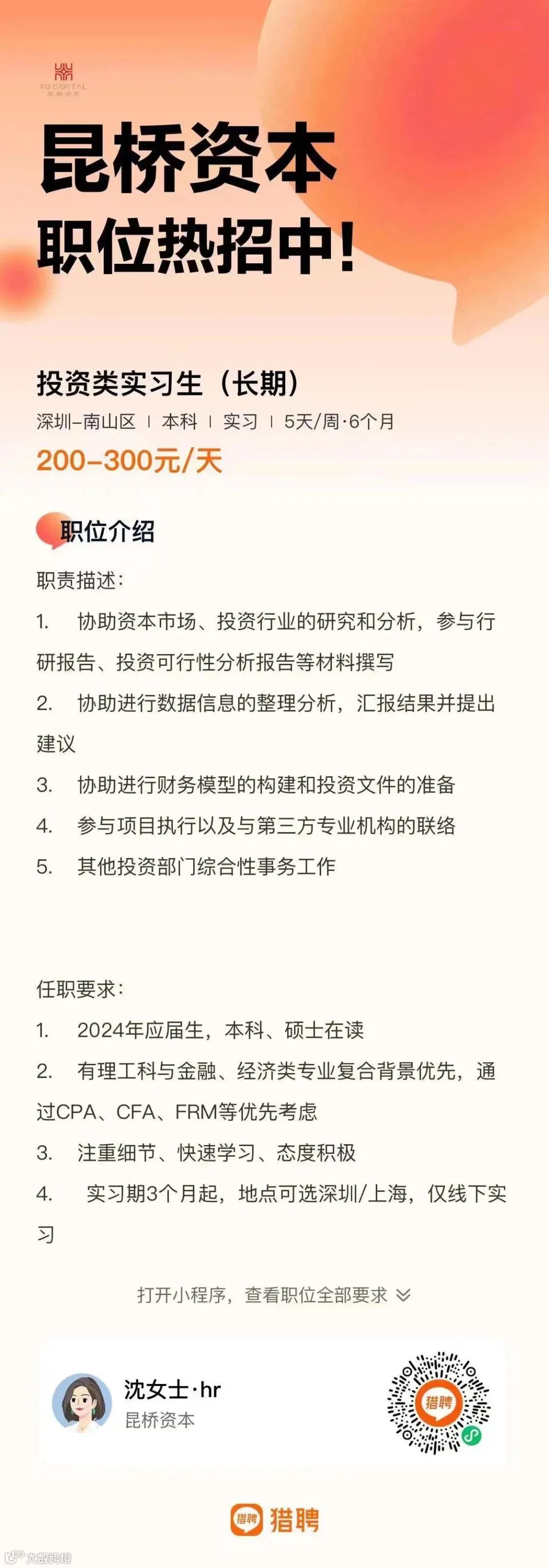 1、重点院校(985、211、QS前100优先考虑)全日制研究生(2024年及以后毕业)、本科生(已保研Or拿到出国Offer),财务、法律、金融、经济、数理等相关专业;
