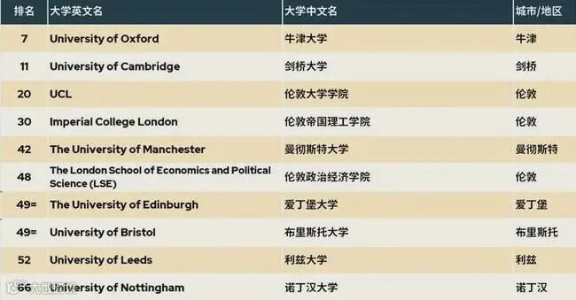 牛津大学是英国唯一进入榜单前十的院校,居世界第7位。