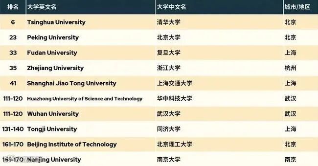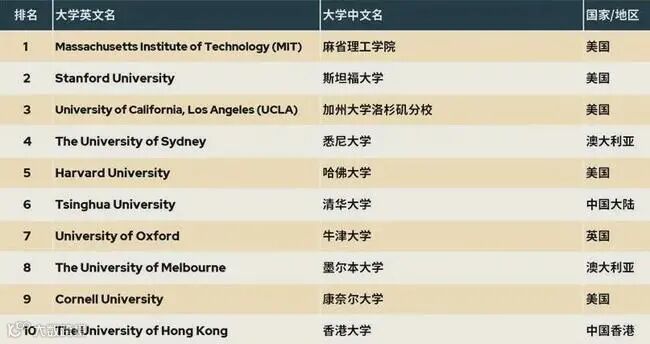 在榜单前十位中,有2所中国高校,分别是位居第6的清华大学和位居第10的香港大学。