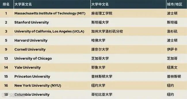 该排名的前三名连续三年保持不变,麻省理工学院卫冕冠军,斯坦福大学和加州大学洛杉矶分校稳居第二和第三。