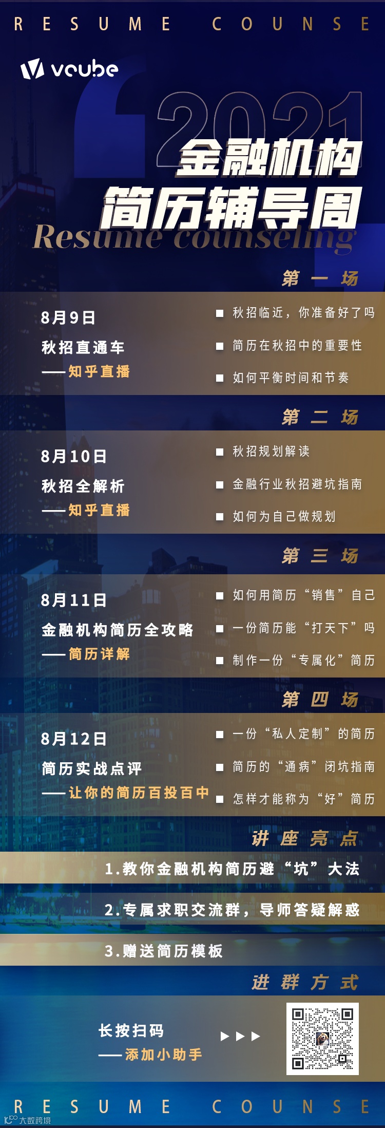 为了让大家更好的准备秋招,更高胜率的斩获秋招offer,金融小伙伴特别在为大家准备了三场全方位解析秋招的讲座,还有免费福利可以领!