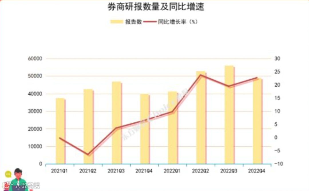 按季度来看,研报产出连续6个季度实现同比正增长,2022年二季度、四季度研报数量同比增长较高,分别增长23.70%、22.65%。