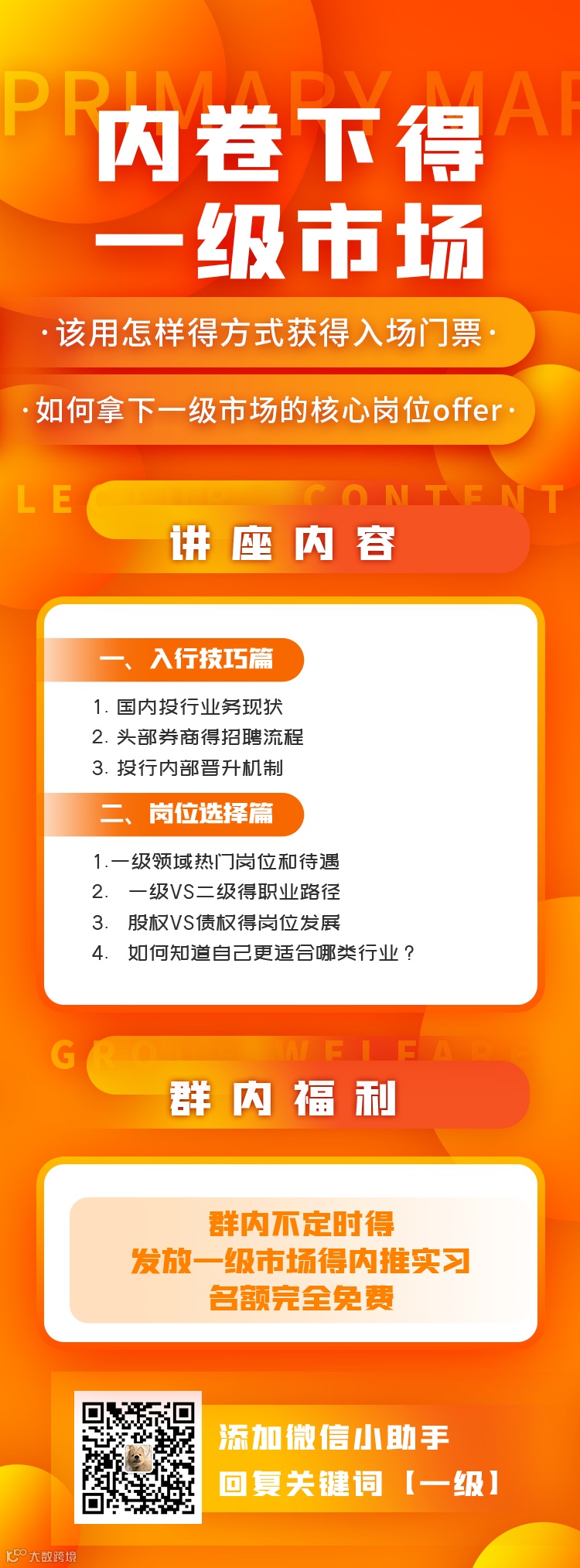 但并不意味着一级市场只有投行,在这简单给大家列举一下,一级市场方向都有哪些:券商投行、PE/VC、FA,信托、融资租赁、资管一级投资岗、险资股权投资部门、企业投融资部门、上市公司投融资部门、央企 / 国企投融资部门等。