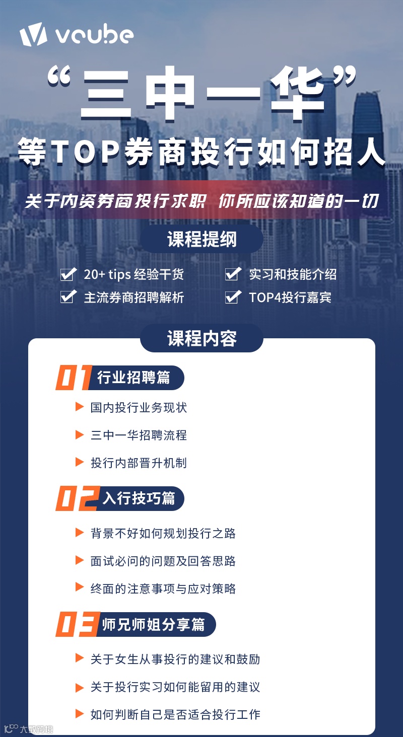 这将是一场空前的行业内部讲座!这将会成为你离“三中一华”国内顶级投行更进一步的高速通道。这将是一场你入职投行前必看的第一课!