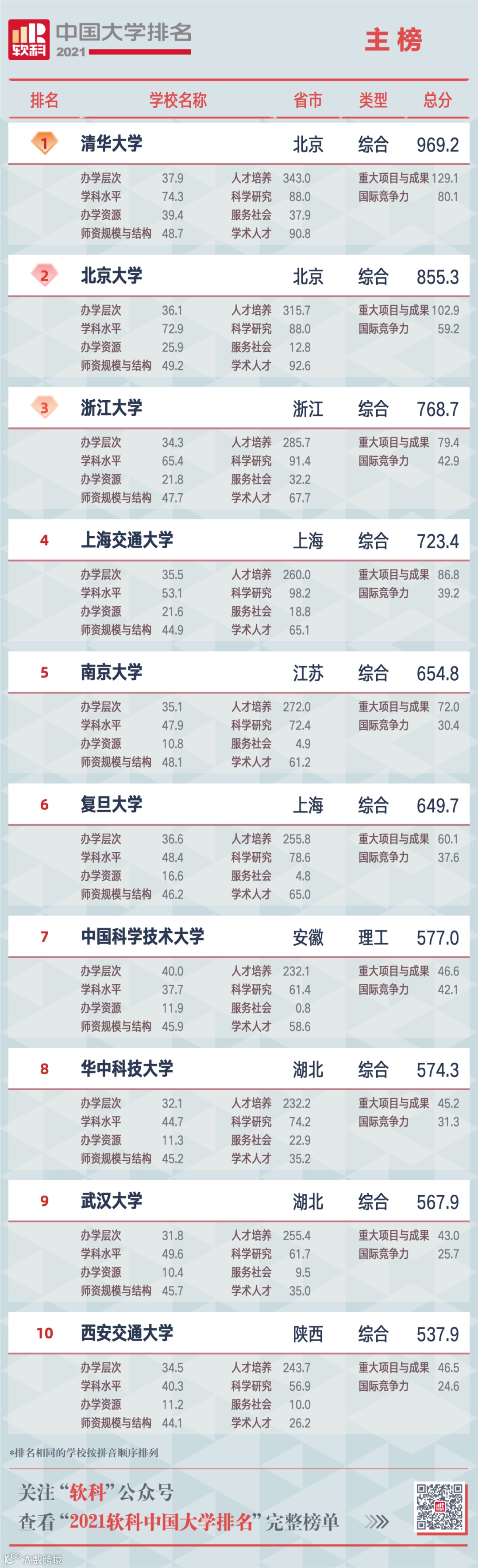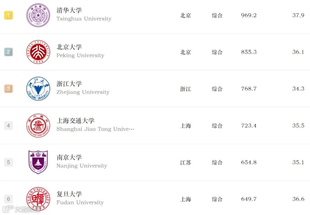 此次进入TOP 10的都是各大榜单上的「老朋友」了:清华大学(第一)、北京大学(第二)、浙江大学(第三)、上海交通大学(第四)、南京大学(第五)。