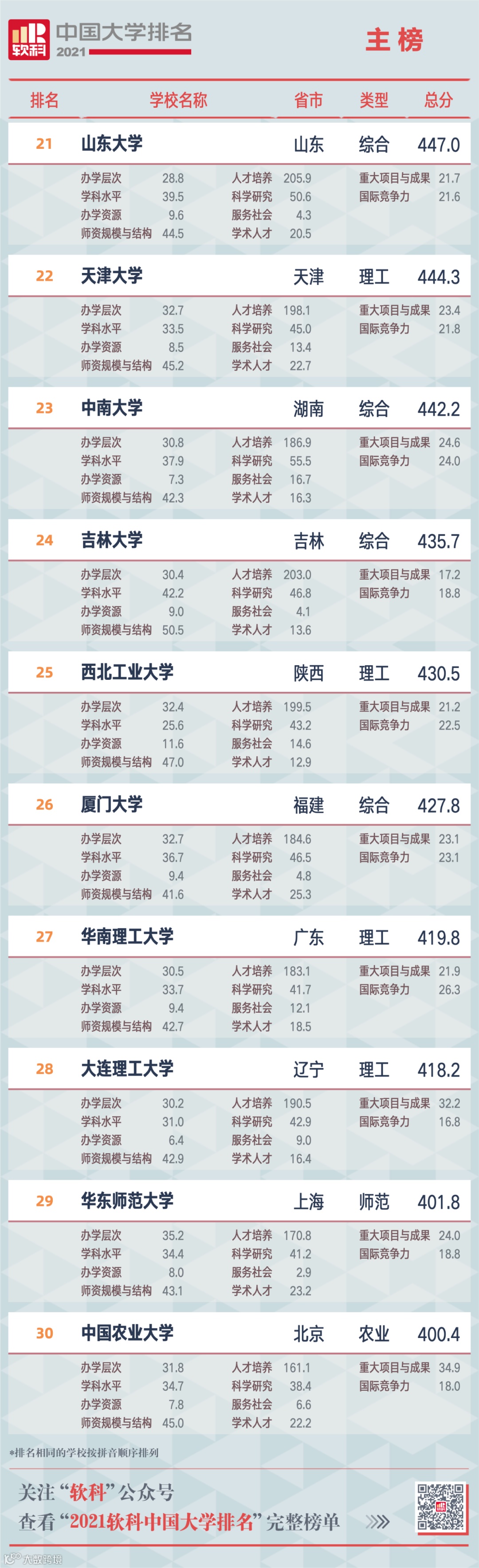 其他位列全国前十名的大学依次为,复旦大学、中国科学技术大学、华中科技大学、武汉大学、西安交通大学。西安交通大学相较2020年排名上升1名,首次入围全国十强。