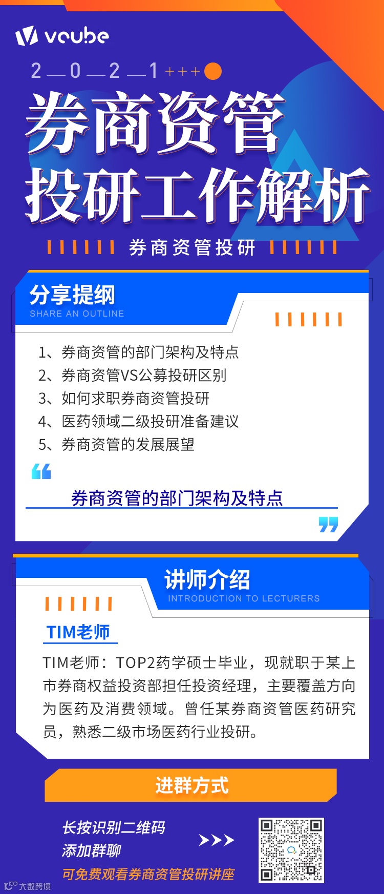 Tim老师:TOP2药学硕士毕业,现就职于某上市券商权益投资部担任投资经理,主要覆盖方向为医药及消费领域。曾任某券商资管医药研究员,熟悉二级市场医药行业投研。