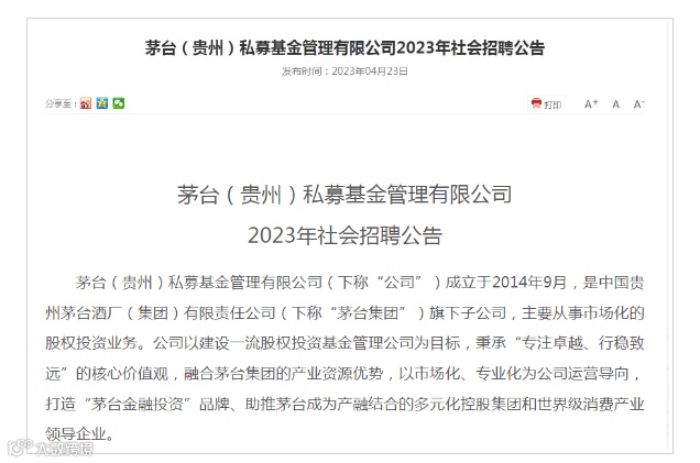 公告称,投资经理需负责以大消费、科技、茅台相关产业股权投资为主要投资方向的投资,构建项目财务模型,进行估值和回报分析,协调外部资源并实施项目尽职调查等工作。