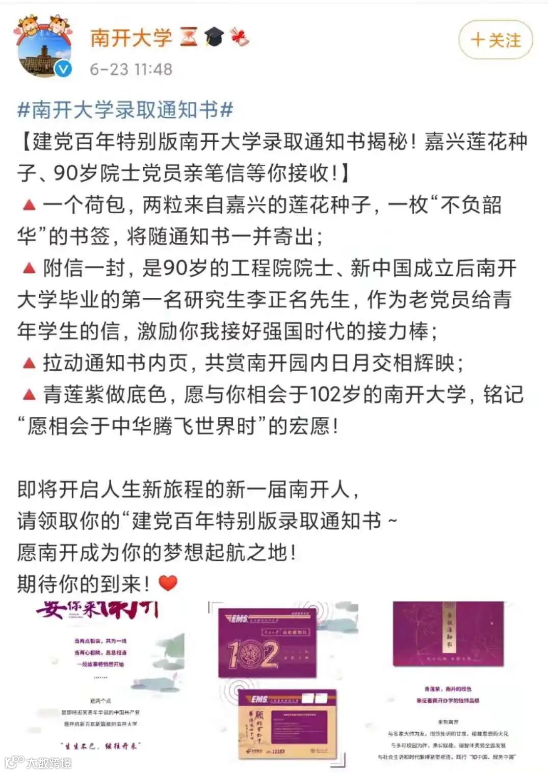 南开的建党百年特别版录取通知书